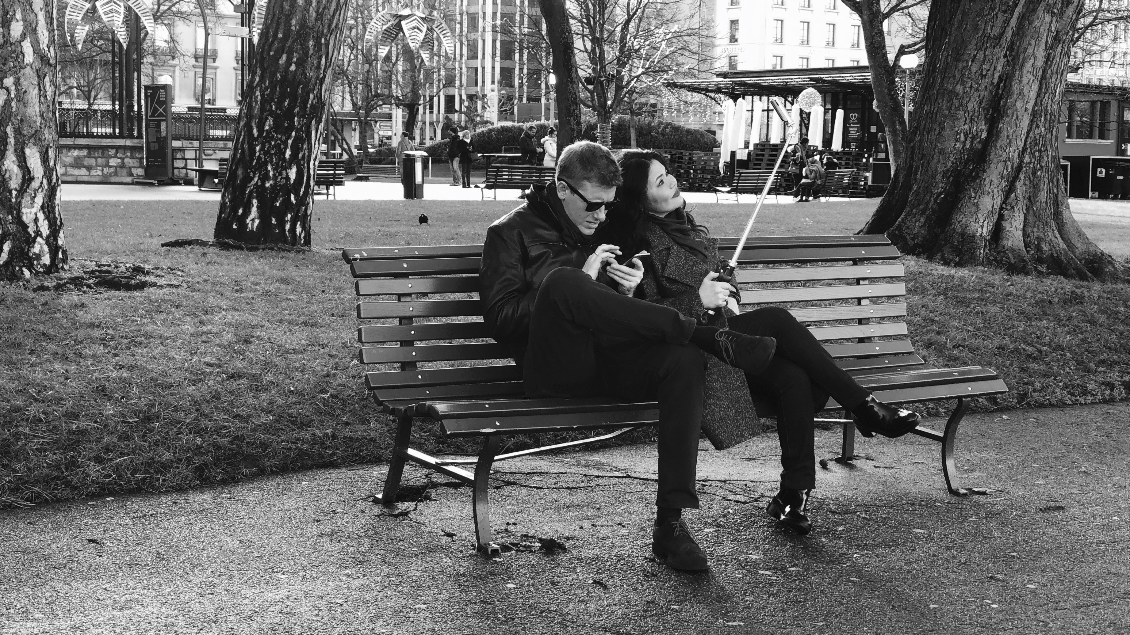 A couple is seated on a bench. Each one is focused on it's own activity.