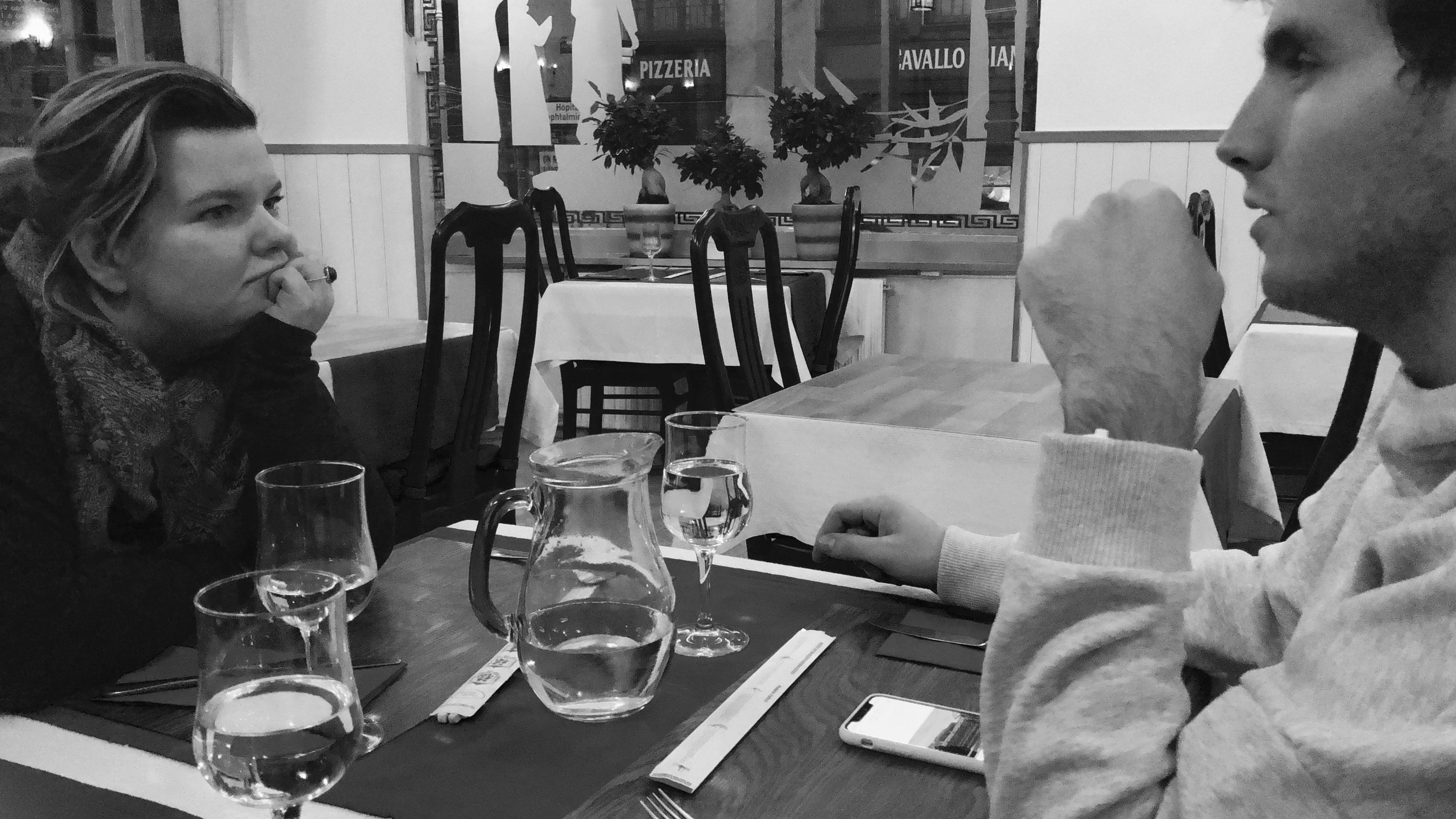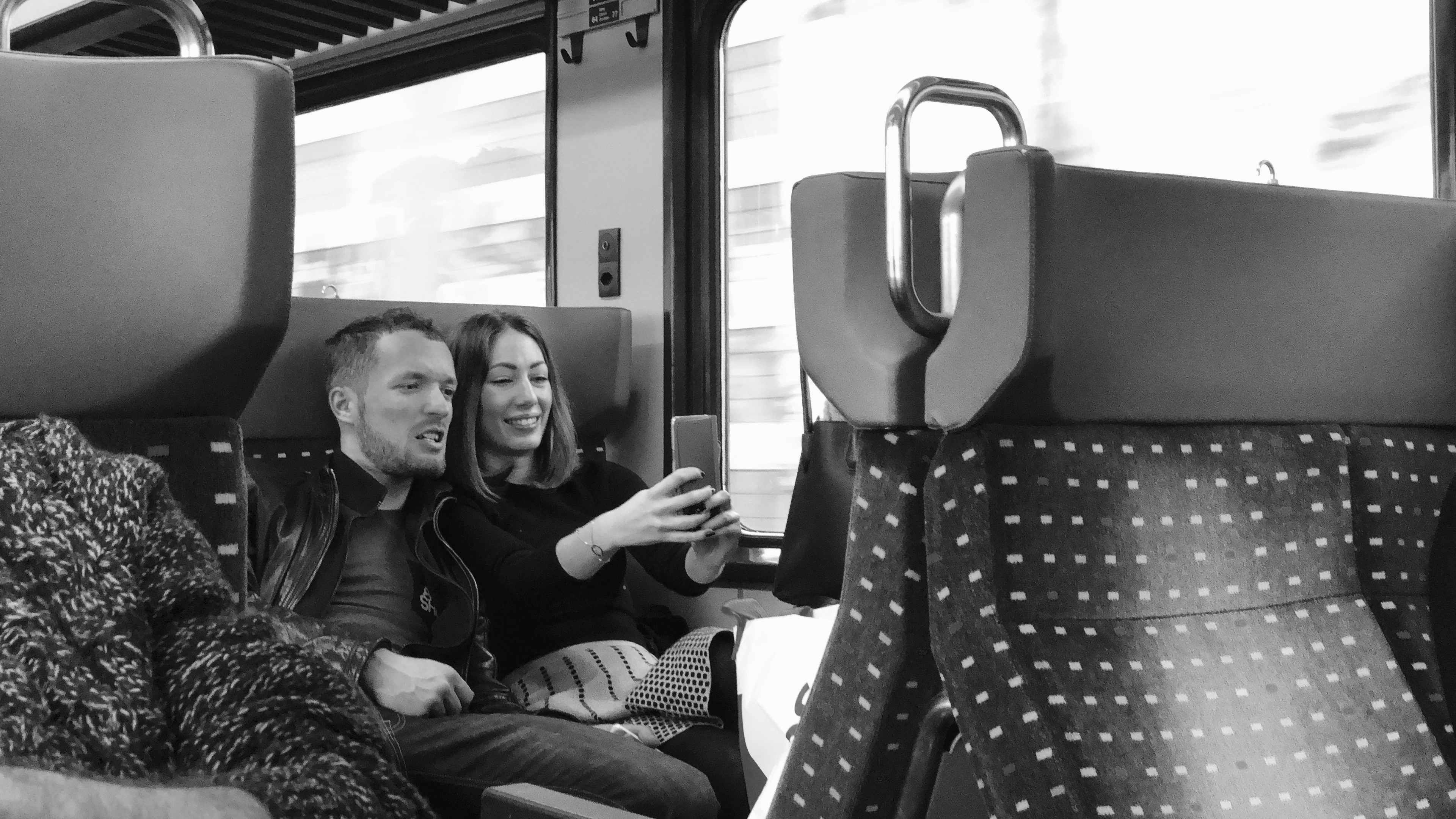 A couple having a conversation. The woman holds her phone to take selfies using Snapchat filters with her husband.