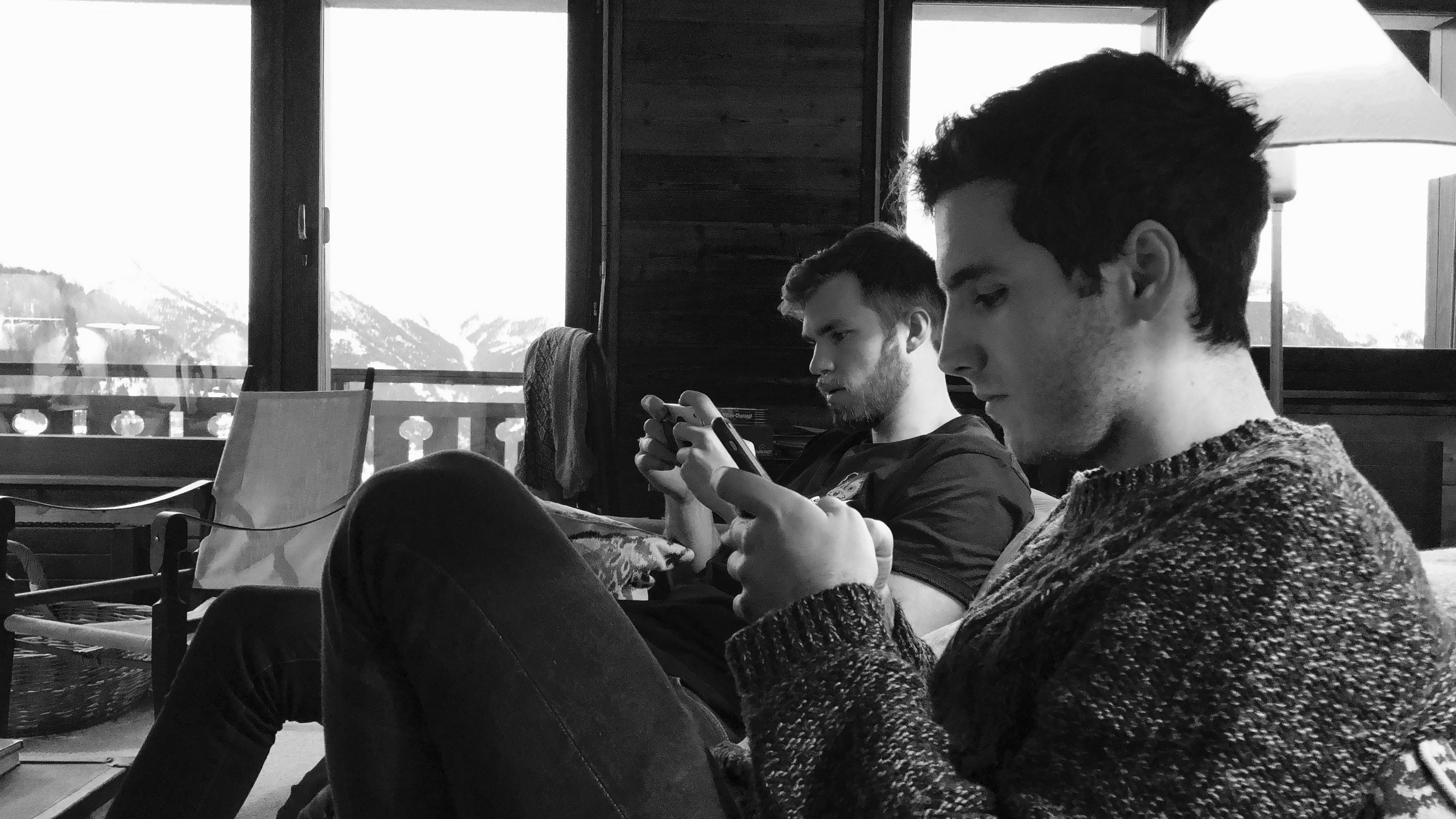 Two men playing games and scrolling on Instagram independently on their own device.