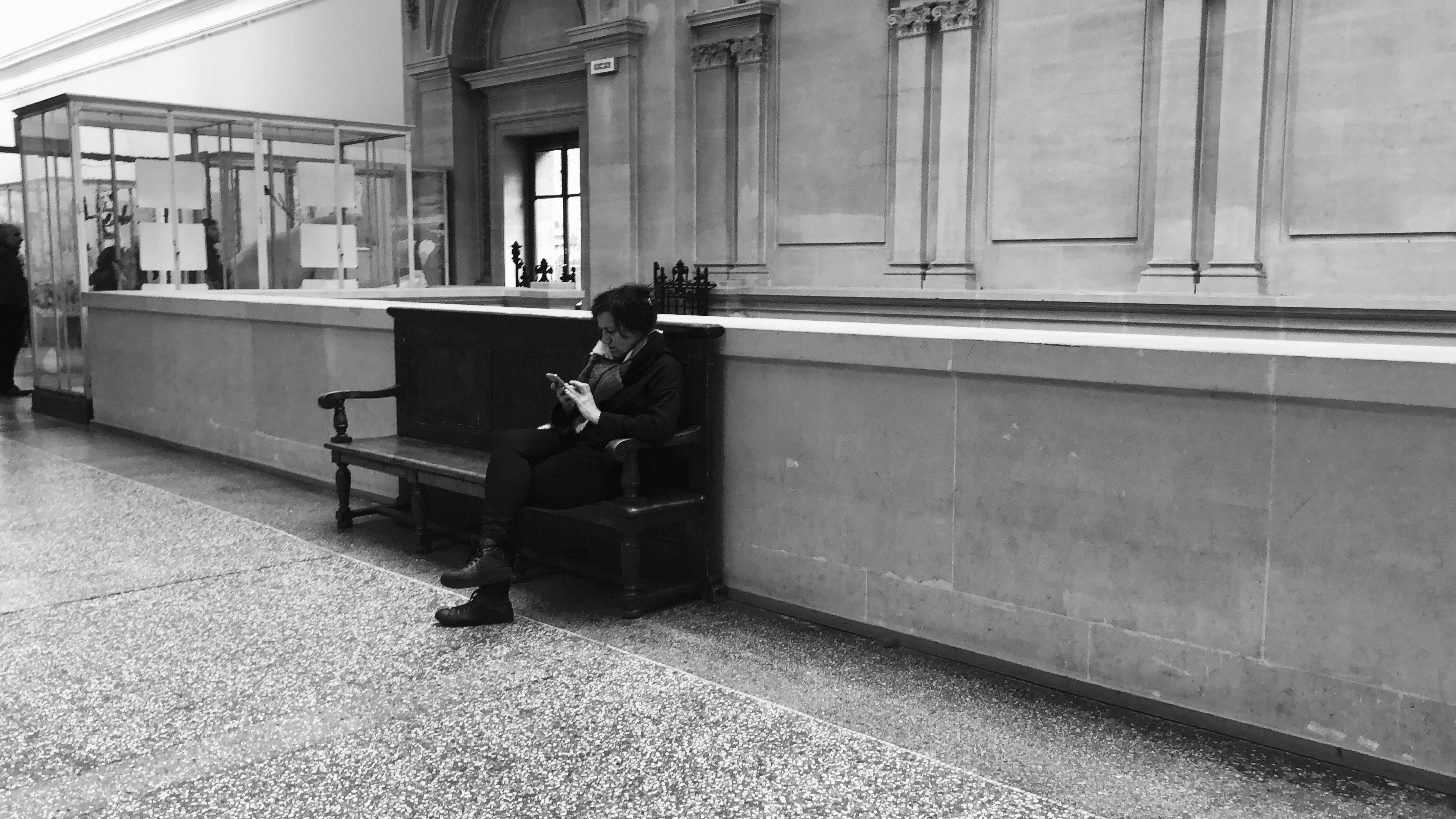 A man is texing while moving inside an exhibition.