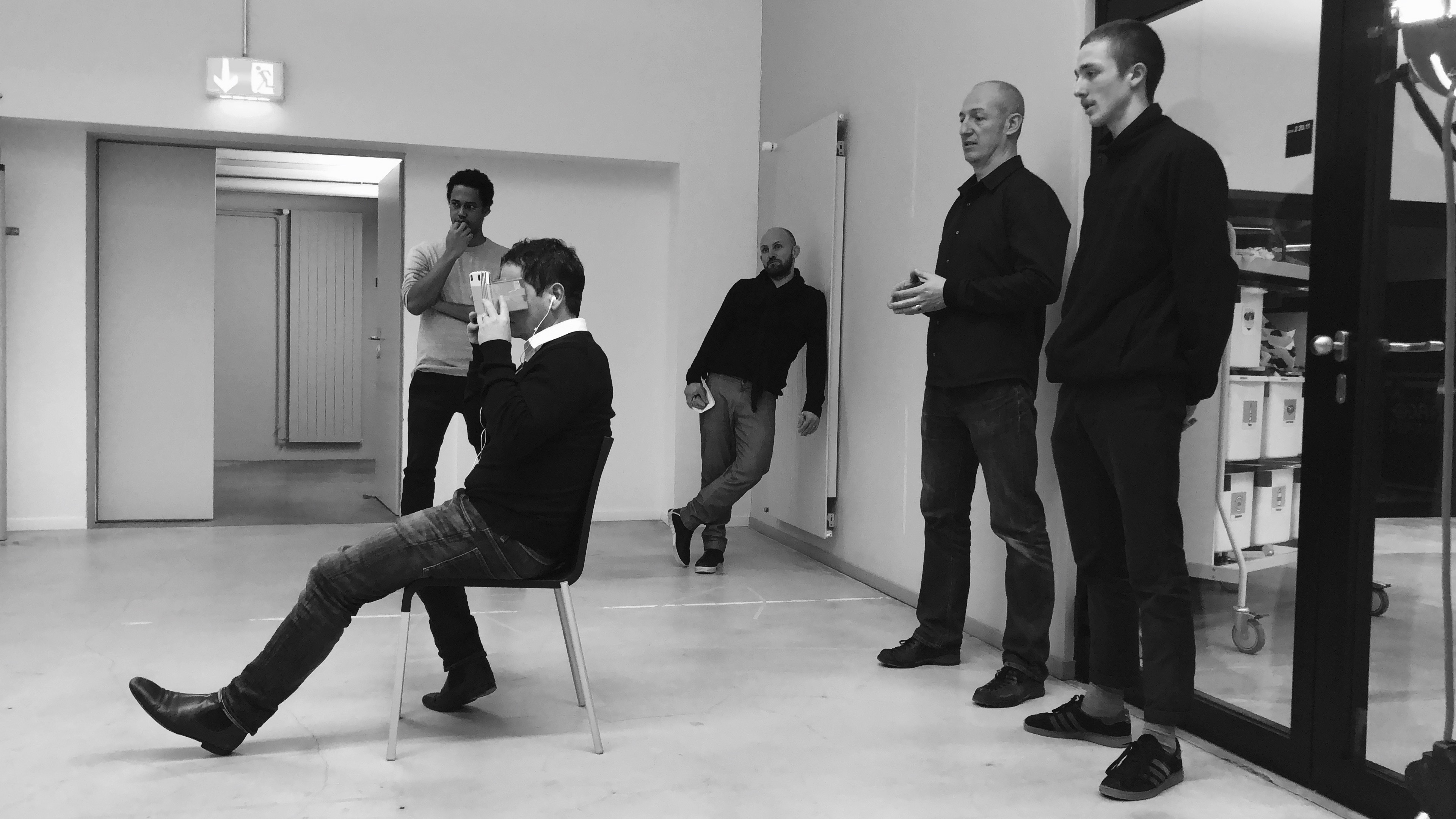 A teacher is visiting and judging a VR installation during semester evaluation.