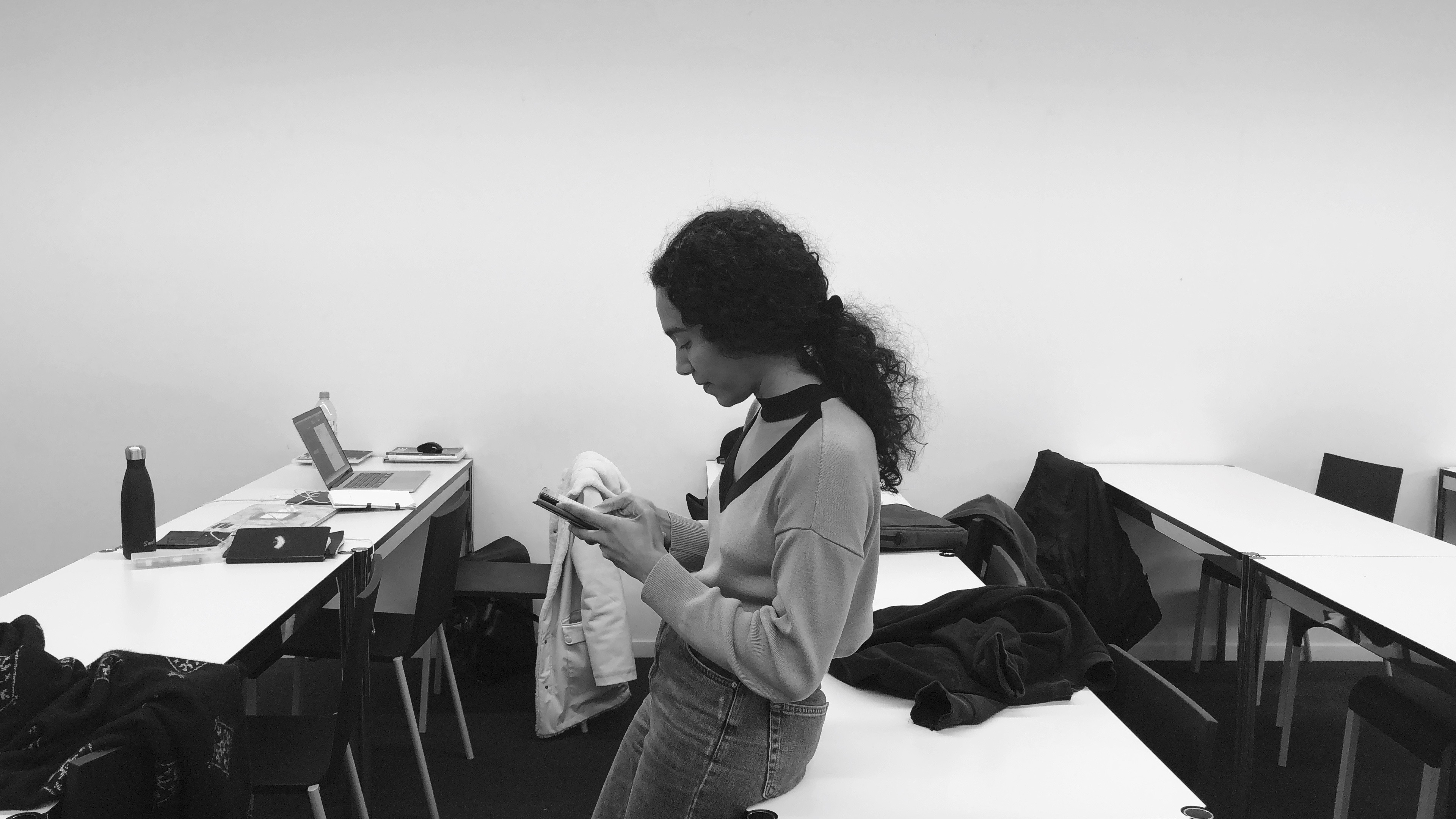 A woman is texting with her AI boyfriend while waiting for a consultation with her teacher.