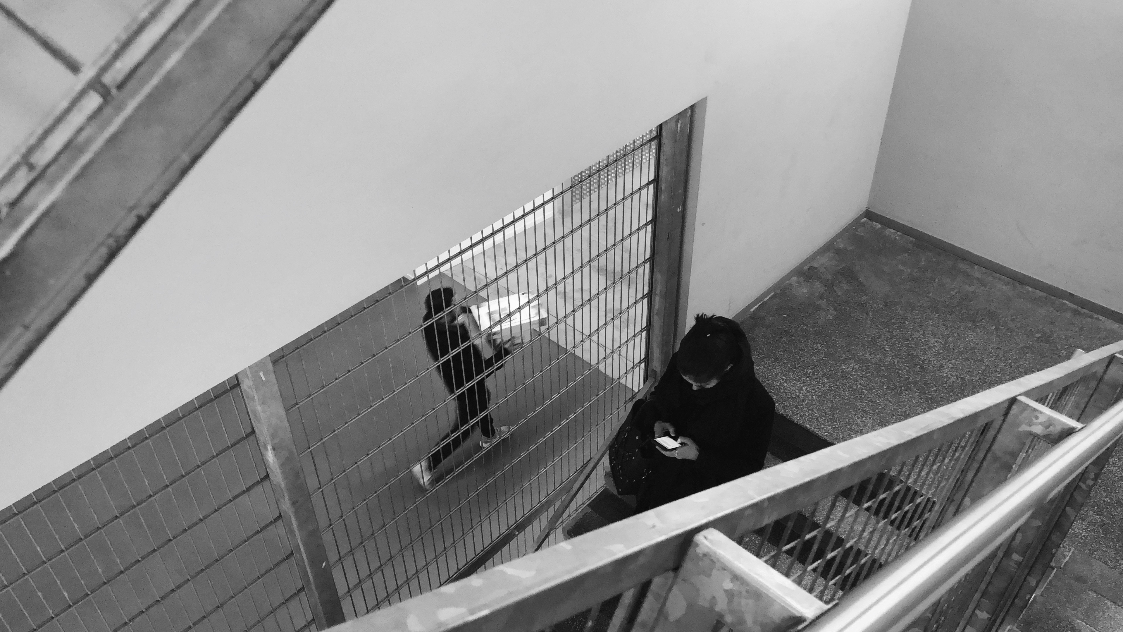 Woman texting while walking down the stairs.