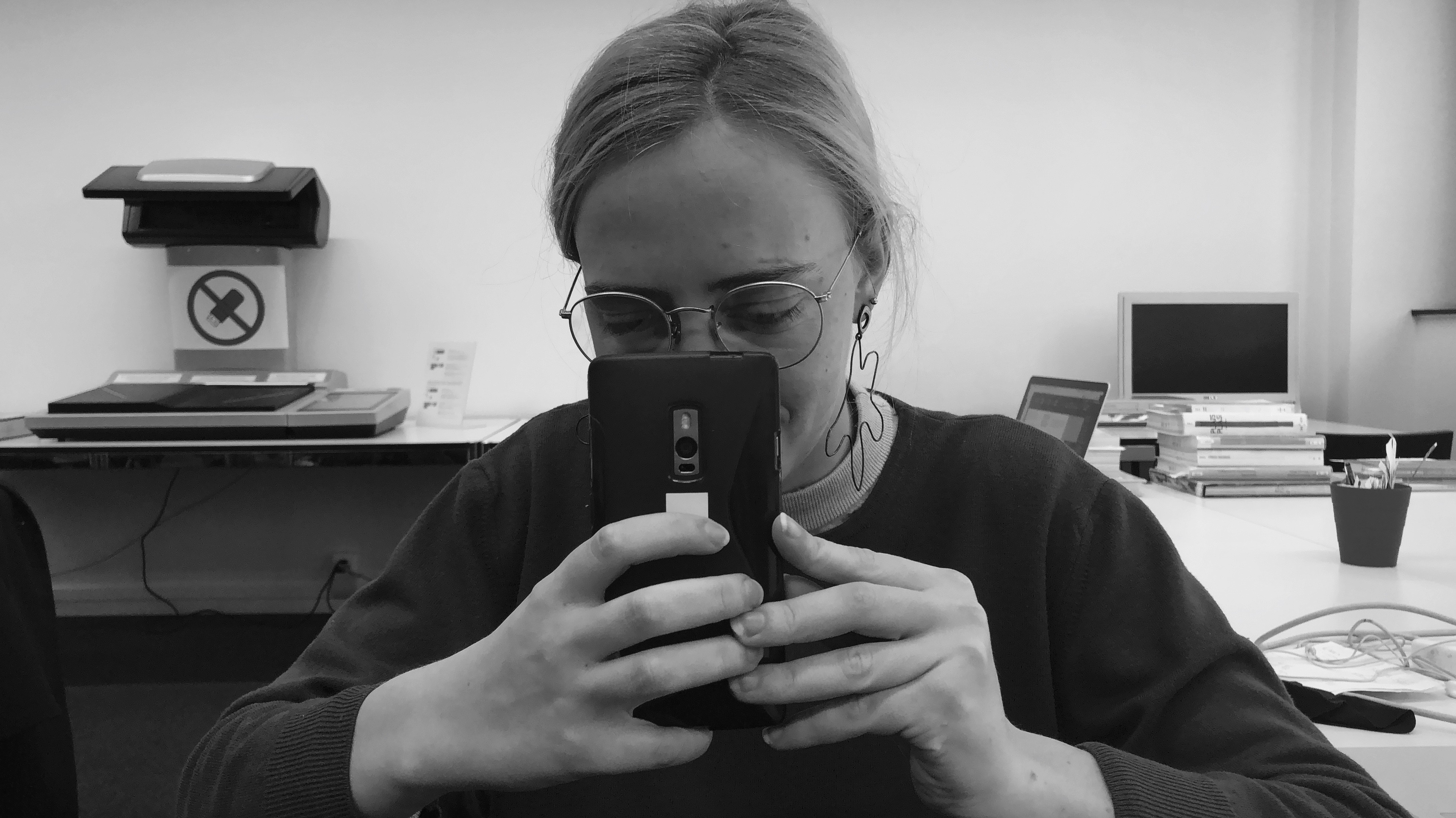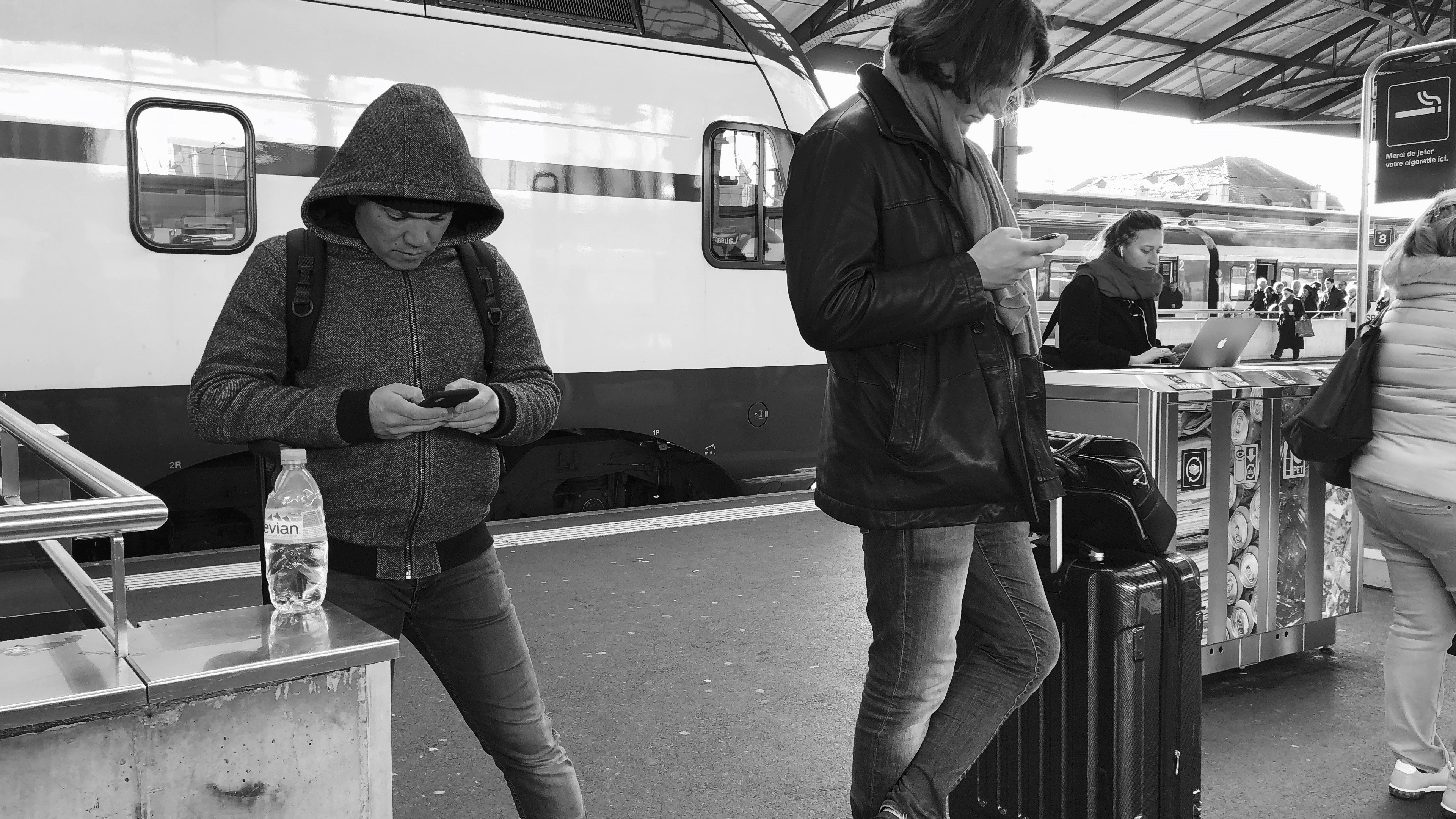 While a man is texting, the other is enterteining himself with digital content. A woman behind is working on her computer over the trash bins.